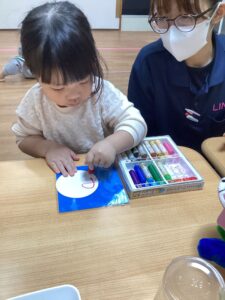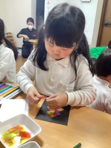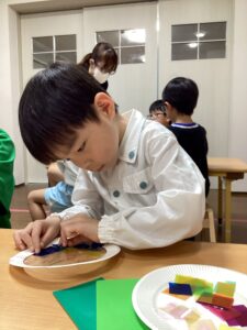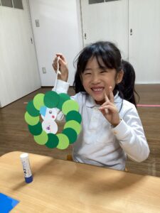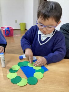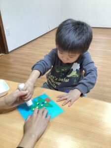 12月はクリスマスを目前にいろいろなクリスマス制作を行いました。午前中は口腔機能の向上をねらいとした「フーフースノードーム」を作りました。シールを貼ったりお絵かきしたりと、支援者と一緒に楽しみながら作る姿がありました。作り終わると嬉しそうにストローで息を吹きかけ発泡ビーズの雪が舞う光景を見て喜ぶ姿がありました。午後の子どもたちは手指の巧緻性を高めることをねらいにクリスマスリースやステンドグラスのツリーを作りました。はさみやのりを使い取り組む子供たち。慎重に型の線を切ったり「ここにしようかなぁ」と貼ったりする姿、手先を上手に使ってちぎり絵に挑戦する姿があり、一人ひとり個性あふれた作品を作り上げていました。「先生、見て」と完成を嬉しそうに報告してくる子どもたち。制作を通して“できた”という達成感を味わっていました。