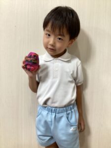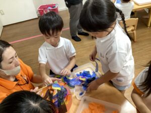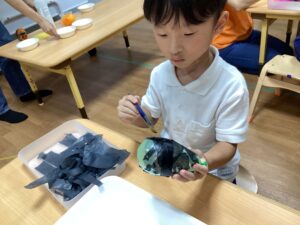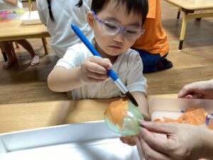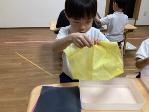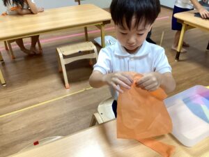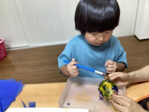 秋といえば、の問いに「おいも。」「まつぼっくり。」「くり。」など、思い思いの秋が聞こえてくる中、「ハッピーハロウィン。」と大きな声が聞こえ「知ってる。」と、子どもたちの目が輝きました。手元の小さな風船に筆を使用して水をつけ、小さくちぎった花紙をそっと貼り付けていきます。水の量や貼る力加減を調整し、さらに花紙の色の重なりにも興味を示しながら、黙々と集中して取り組んでいました。