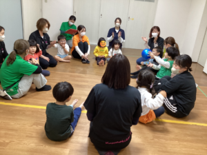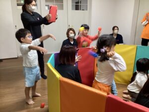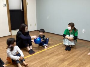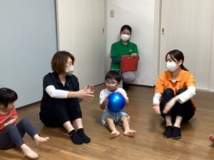 支援者も含め全員で円になり、音楽に合わせてボールを隣のお友だちに渡します。音楽が止まったときにボールを持っている人が自己紹介をする約束を聞くと、ボールがどこで止まるかドキドキしながらお隣のお友だちに渡し、自分の前にボールが止まると照れくさい顔をしながらも、しっかりと自分の名前や園名、好きな食べ物などを自分の言葉で周囲に伝えることができ、お兄さん、お姉さんになったかっこいい姿がみられました。
