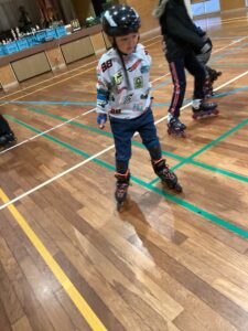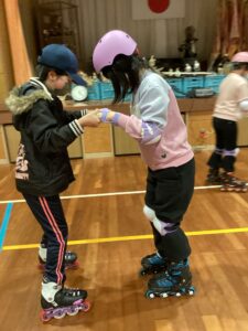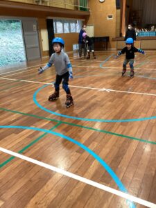 1月24日、外出活動にて「インラインスケート」に取り組みました。前回と同じく南さつま市にある旧田代小の体育館をお借りし、NPO法人鹿児島スライドサークルのインストラクターさんにご指導いただきながら取り組みました。前回経験をした子どもたちは靴を履いてすぐに立って前進したり、両足ジャンプをしたりする子もいました。一方、今回が初めての子どもたちはインストラクターさんから滑り方や止まり方、転んでしまった時の立ち上がり方などを教わりながらそれぞれ取り組んでいました。コツをつかむと、屋内を周回したり、コーンを左右交互に進んだりと時間いっぱい練習し、それぞれ上達した姿が見られました。中には、転ぶことが多かった子も、コーンを左右交互に進めるようになり、「上手」と褒められる子もいました。約2時間があっという間に過ぎ、片付けの際、初めてスケートをした子から「またやりたい」という声も聞かれました。