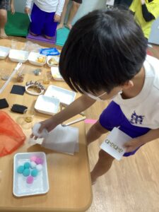 先日、子どもたちと一緒に「感覚仕分けゲーム」を行いました。この遊びは、視覚・触覚・嗅覚・聴覚など、色々な感覚を使って素材を仕分ける活動でした。