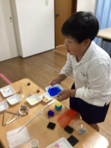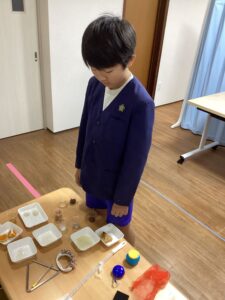 テーブルの上には、「ふわふわ」「つるつる」「シャカシャカ音がする」などの指示カードと約20種類の素材がずらり!子どもたちは、目で見て、触って、においを嗅いで、「これはどんな感じがするかな?」とじっくり観察していました。「これって、ふわふわしてる!」「シャカシャカ音がした!」「花のにおいがするよ!」そんな声があちこちから聞こえてきてとても賑やかに友だちと正解を話し合う姿も見られました。最後にみんなで振り返りを行うと、「人によって感じ方が違って面白い」「目をつぶるともっとよくわかる」といった感想が出てきて感覚を意識するよいきっかけになったようです。身の周りにある物でも、意識して触ってみるといろんな発見があります。今後も、遊びながら、五感を育てる活動を続けていきたいと思います。